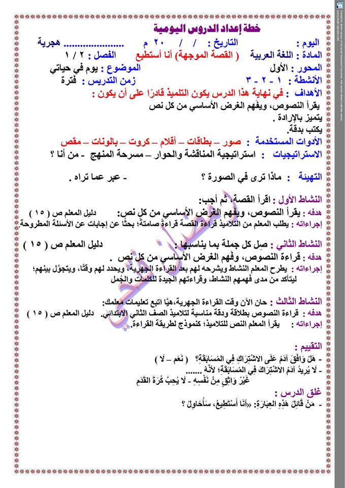 دفتر تحضير نموذج تحضير درس لغة عربية للصف الثانى الابتدائى